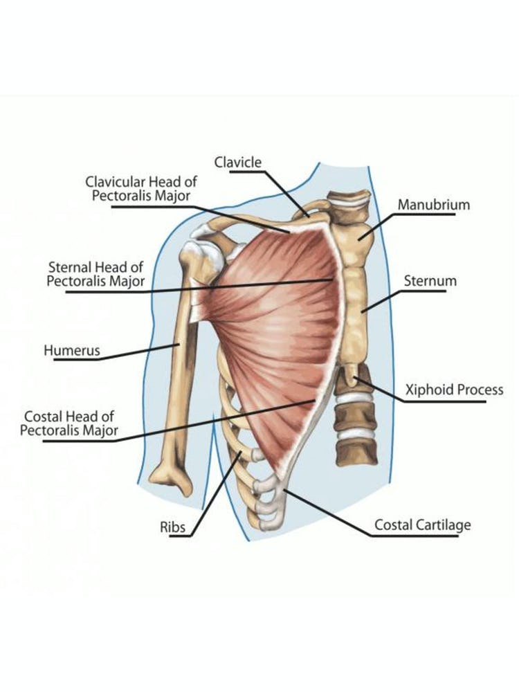 When discussing the upper chest, we’re only talking about one muscle: pectoralis major. However, the pec major consists of three distinct portions of muscle fibers, called heads, and the way they’re arranged determines their function (i.e., the mechanics you need to use to develop them). From the top down, the sections of the pec are: