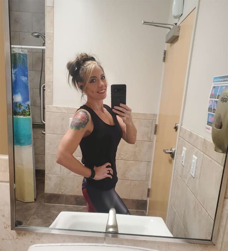 I’m around 115 pounds now, at 5’ 2”, but I don’t get on the scale very much. The reason for that is because I could get really caught up in it, and I don’t want to because I have body image issues. I still see myself as 200 pounds, so it doesn’t matter how much I work out—200 pounds is what I see. I don’t want to get caught up in the whole number thing, so I just work out to feel good. Working out is my therapy. I was on so much anxiety medicine before, and now I’m on none.
