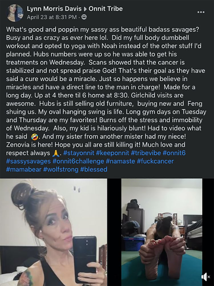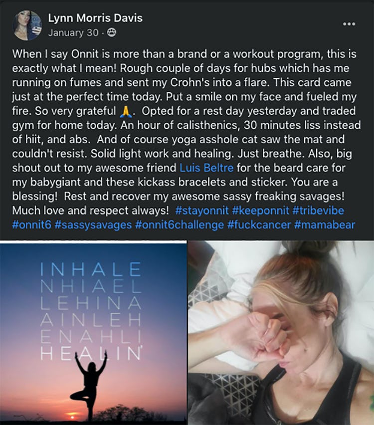 Even with all these responsibilities, Davis, 46, from Raeford, North Carolina, routinely makes time for her second family—the Onnit Tribe. A private Facebook group of Onnit fans who support one another in their fitness and life goals, the Tribe has become both a refuge for Davis and a source of strength. It’s had her back while she’s completed every Onnit 6 program, participated in nearly every Onnit 6 Challenge, taken her hubby in for immunotherapy and chemo treatments, and more.