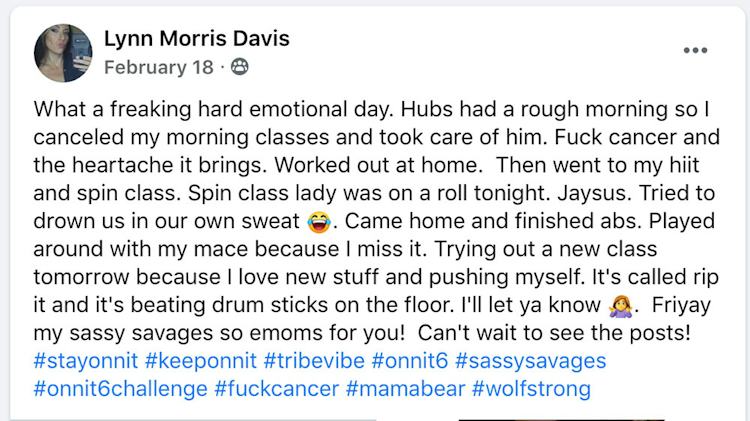 So, while Davis often doesn’t want to work out, she usually does. And she’s returned the love the Tribe has shown her with so many supportive and nurturing posts urging other member to do the same that she’s earned the nickname “Mama Bear” within the group.