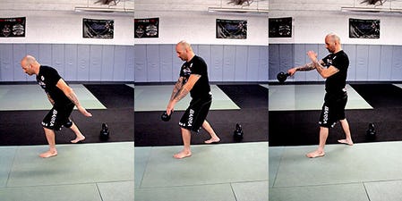 Kettlebell Combat Cleans are the second progression. This is where we start adding an even more sports- specific aspect to the kettlebell. This exercise is about as close as you can get to throwing a punch. When throwing a punch, most fighters can tell you the power comes from your core.