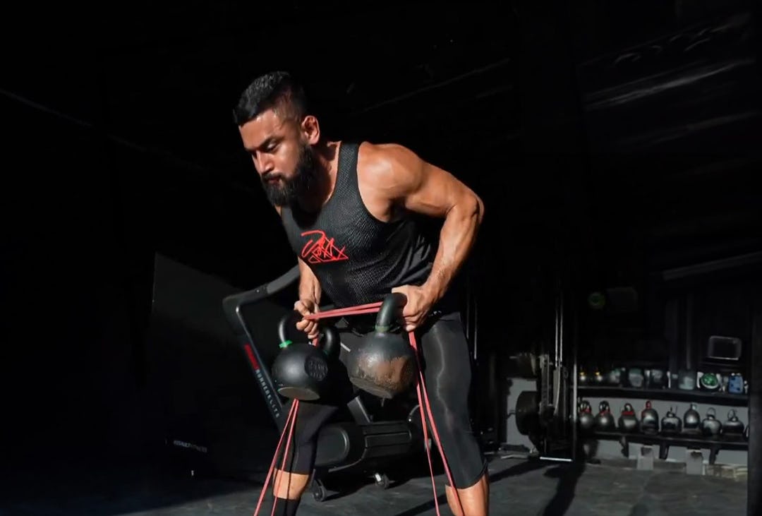 The following workout is brought to you by one of our favorite mad scientists—the Onnit-certified Eric Leija (@primal.swoledier)—who came up with it while experimenting in his own garage gym. The routine requires only a pair of moderate-weight kettlebells (16kg are good for most guys; 8kg for ladies), and a light resistance band (we like the mini available at elitefts.com), and trains your chest, shoulders, arms, and upper back muscles in under 30 minutes.