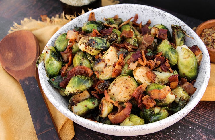 SIDE DISH: Crispy Bacon Brussels Sprouts with Whole-Grain Mustard Sauce