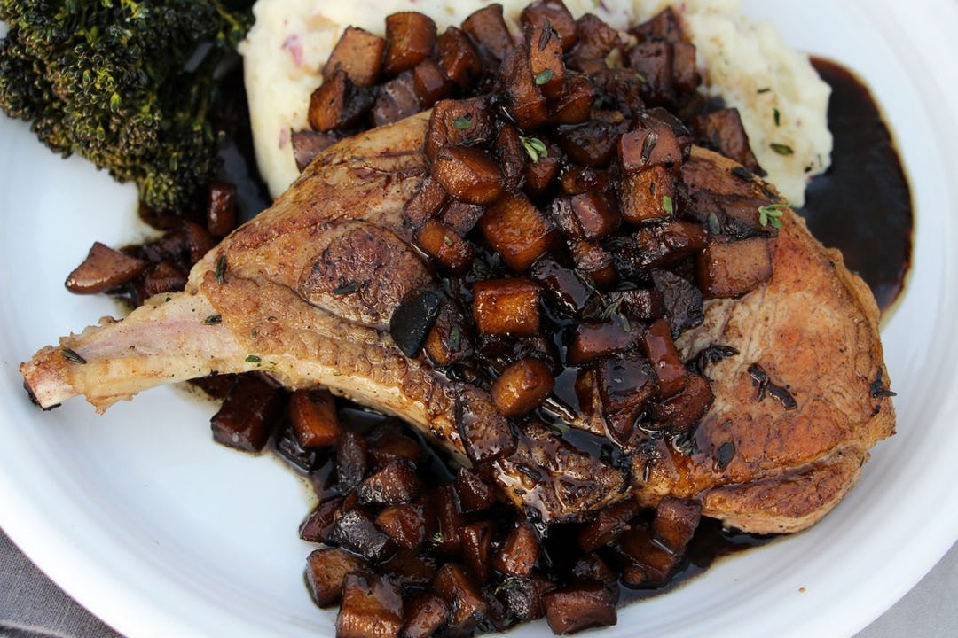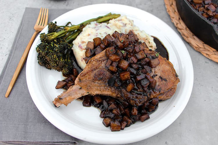 Step 7. Add the diced apple and butter to the skillet and turn heat to medium-high. Stir and cook the apples until softened. Then add the spices, vinegar, coconut sugar, and maple syrup. Lower the heat to medium-low, and reduce to a syrup consistency, about 6 minutes. Serve the spiced apple over the pork chops, and with the mashed potatoes and broccolini on the side.