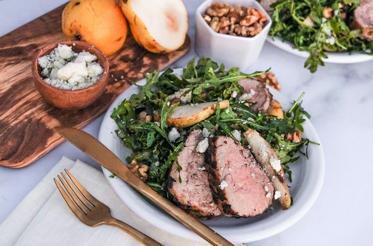 Pear + Blue Cheese Arugula Salad with Grilled Pork Tenderloin