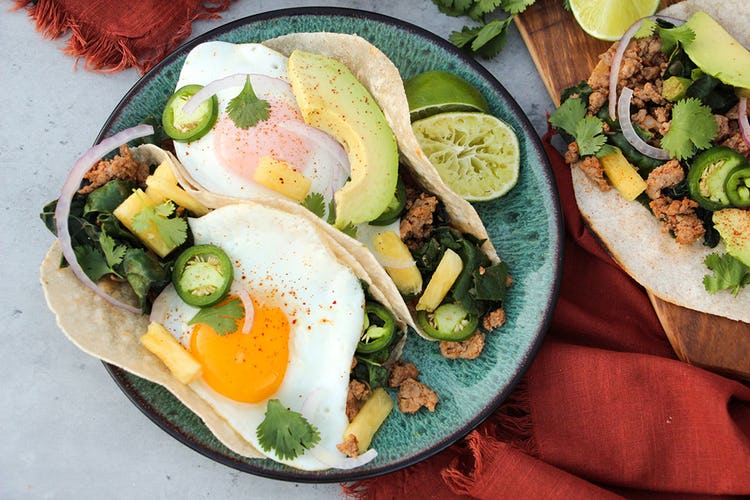 Step 7. Assemble tacos with the pork-kale mixture on the bottom, then top with egg, avocado, pineapple, jalapeno, onion, and fresh cilantro. Serve with a lime wedge.
