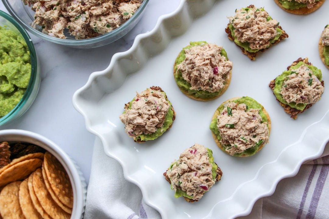 Step 4. Place crackers on a plate. Spread one teaspoon of mashed avocado onto each cracker, then top with tuna. If traveling, keep the tuna salad, mashed avocado, and crackers in separate containers until you’re ready to prepare.