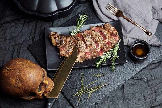 - Add the steak to the oiled very hot pan. The cooking times will vary based on the thickness of the steak, but I recommend about three minutes per side for 2-inch thick steak. Remove from heat and baste with the herbed ghee or butter, adding the herbs and garlic on top of the steak as you baste to add more flavor. To baste, tilt your pan to the side, which is basically an arm workout considering the weight of a cast-iron skillet, and continue to spoon the ghee on top of the steak to get a more golden crisp. Repeat on the other side. For this Halloween recipe, I like a bloody medium-rare steak, which is about 130-degrees Fahrenheit so make sure you double check with a meat thermometer.