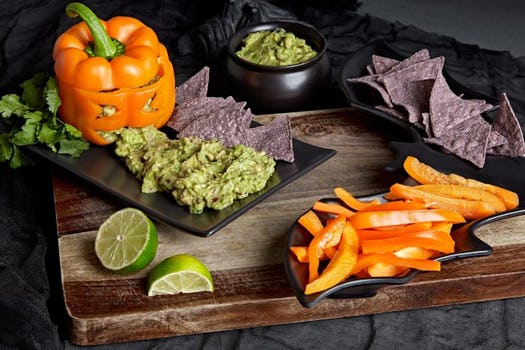 - Using a spoon, add the guacamole to the inside of the carved bell pepper and add what’s remaining to appear like it’s pouring out of the mouth on the serving platter. Serve with sliced bell peppers, blue corn chips, and pork rinds (if a crunchy keto option is desired). Serve immediately.