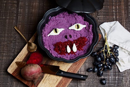 - I would recommend kitchen gloves for this portion (I learned the hard way). Finely dice the beet into very tiny pieces for the monster mouth. Roll and mold the goat cheese to form the eyes and teeth. Slice the olives for the eyes. Get creative! This part would be fun for the kids, or adults. I love playing with food, especially when I can eat it afterwards...