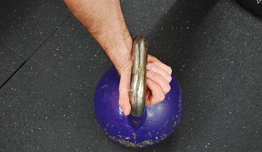 One advanced tip to help you setup a better rack is to grab the kettlebell by the horn and not in the center of the handle. This simple switch will create an effortless transition to get the handle of the kettlebell diagonally across your palm and crease of your wrist.