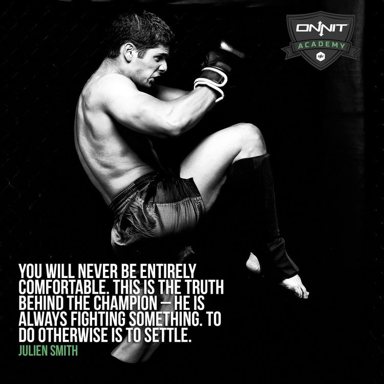 You will never be entirely comfortable. This is the truth behind the champion – he is always fighting something. To do otherwise is to settle.” – Julien Smith