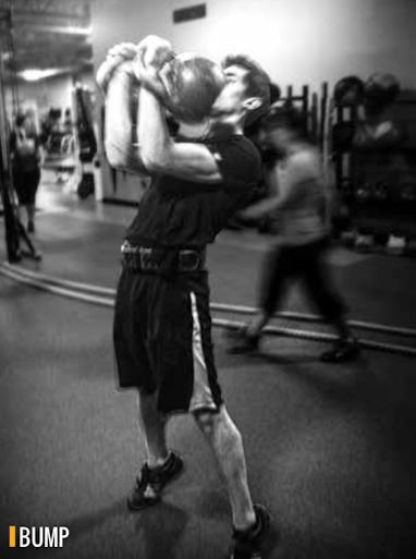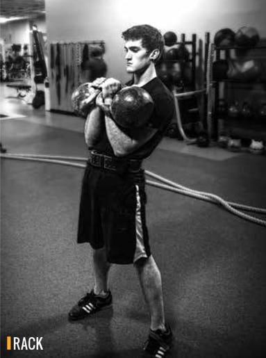 The triceps are turned “off” and the bells are lowered to the rack position via a controlled drop. The force of the bells coming down is absorbed by raising up on the heels and bringing the chest toward the bells. As the elbows begin to land in the rack position, the heels are lowered and the thoracic spine rounded to safely diffuse the load. The knees may be bent slightly as well. The key is timing the bell to body contact with the shock absorption mechanics.