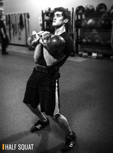 While keeping the pelvis forward, drop into a shallow knee bend. Two important points here are to first, “drop/fall” into the Half Squat to activate a stretch reflex instead of descending slowly. Second, maintain connectivity between the elbows to torso and heels to ground. This maximizes power transfer from the lower body to the upper body and arms.