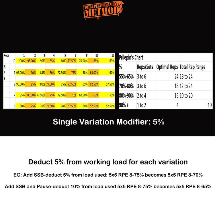 Having seen all of the above programs work well for some people and poorly for others, I started experimenting with a new system that combines the best aspects of each and, I believe, minimizes their flaws. The Total Performance Method, named after my facility, Total Performance Sports, in Malden, Mass., is a conjugate system that uses percentages and RPE.