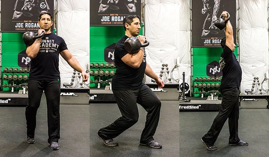 The workout plan for the Onnit Academy Gym this week includes the Alternating Double Kettlebell Rack Reverse Lunge Test, the Kettlebell Staggered Stance Push Press, and Battle Rope Sidewinder Hook.