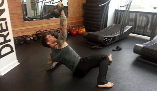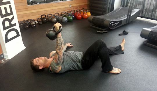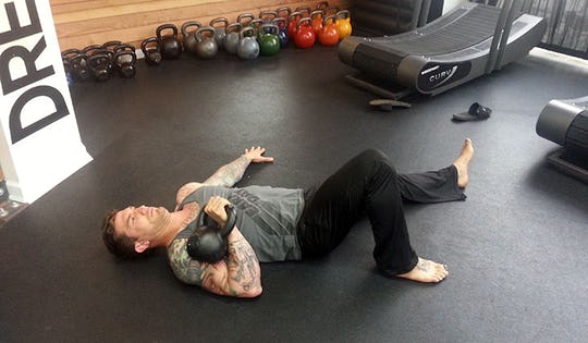 Begin by laying next to a kettlebell on your right side, rollover to the kettlebell, lift up the kettlebell with your right hand, assisting the bell with your left hand. Once you’re set and on your back, you are ready to fight through the next steps…