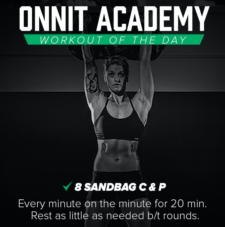 Perform 8 reps of the sandbag clean & press. Rest for the rest of the minute and start the next round on the next minute. Repeat for a total of 20 minutes. Record your total time in the comments section. The goal of this training session is General Physical Preparation and to increase your workout capacity.