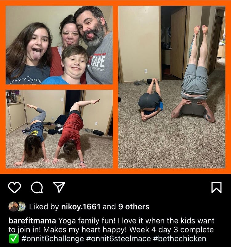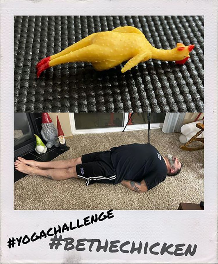 Josh: It started as an inside joke in our family. We had a couple rubber chickens placed around the house, just as a goofy decoration. During one of the workouts in our first Challenge, Mari and I were doing a yoga pose, and I’m not very good at yoga. I said to her, “I feel like a rubber chicken right now.” So we came up with this hashtag, “Be the chicken.”