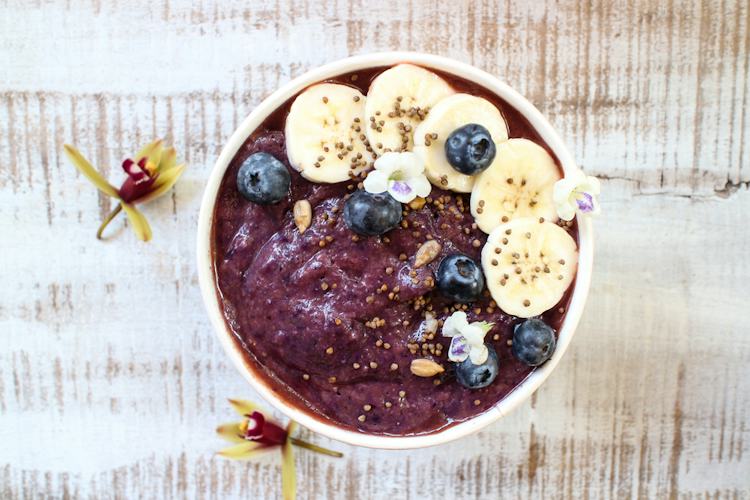 • Toppings: fresh blueberries, ¼ banana sliced, 1 tsp. bee pollen, raw honey drizzle