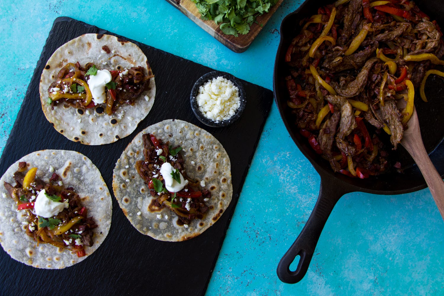 5. Serving options: Serve fajitas with organic sour cream or full-fat Greek or Skyr plain yogurt for some added probiotics, queso fresco crumbles, and fresh chopped cilantro. If storing in fridge for meal prep, keep the meat, onions and peppers in an air-tight container, and the tortillas and toppings separate for maximum freshness.