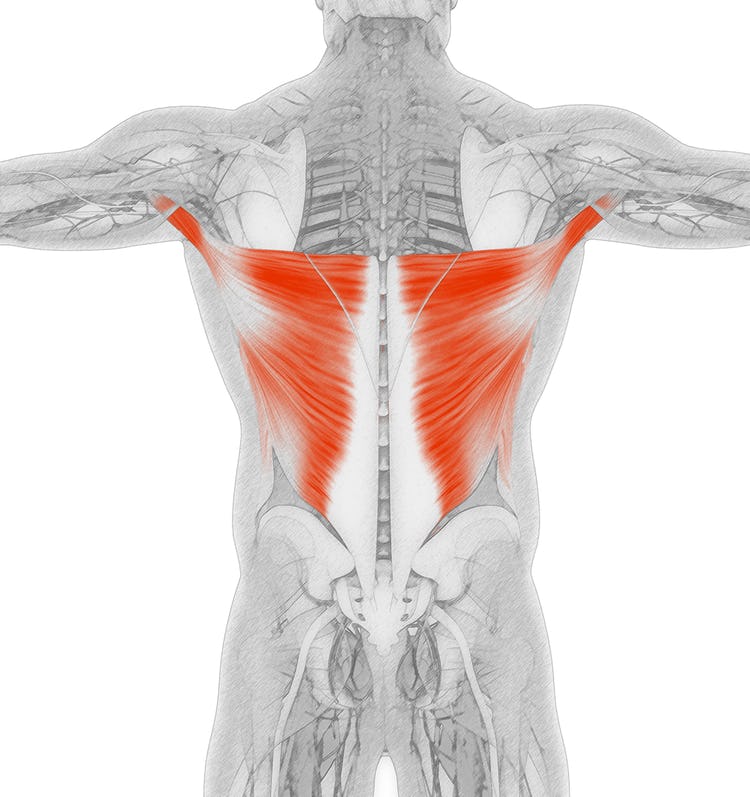 3. While keeping your shoulders down and your lats tense, roll your shoulders forward and slightly upward. Your chest and ribcage should lift in front of you, “nice and high and proud,” says Catanzano. Think about spreading your lats apart as wide as you can.