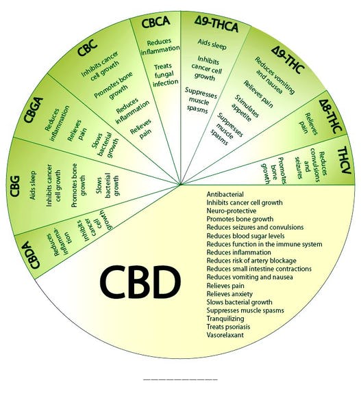 And then there’s cannabidiol (CBD), pictured right, which is one of at least 85 active cannabinoids identified in cannabis, but is a major part of the cannabis plant, accounting for up to 40% of the plant’s total cannabinoid extract. CBD has long been researched for a much wider scope of medical applications than tetrahydrocannabinol (THC). We’ll get into the most relevant of those medical applications later.
